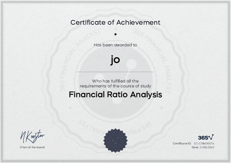 This user has been awarded the Financial Ratio Analysis Certificate for successfully completing the course exam. Holding this certificate demonstrates their proficiency on the topic and signifies they are qualified to apply their newly acquired expertise in the fields of data analytics and data science.