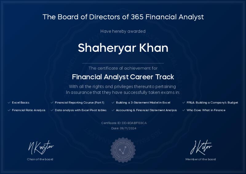 This user has been awarded the Financial Analyst Career Track Certificate for successfully completing all courses and assessments. This certificate confirms their technical expertise and professional credibility to work as a financial analyst.