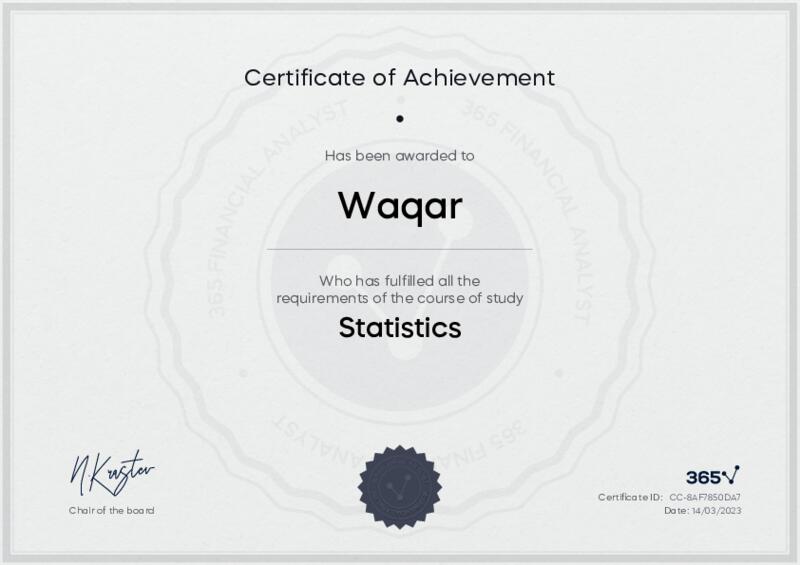 This user has been awarded the Statistics Certificate for successfully completing the course exam. Holding this certificate demonstrates their proficiency on the topic and signifies they are qualified to apply their newly acquired expertise in the fields of data analytics and data science.