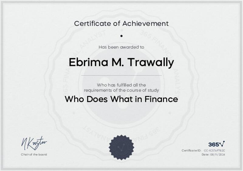 This user has been awarded the Who Does What in Finance Certificate for successfully completing the course exam. Holding this certificate demonstrates their proficiency on the topic and signifies they are qualified to apply their newly acquired expertise in the fields of data analytics and data science.