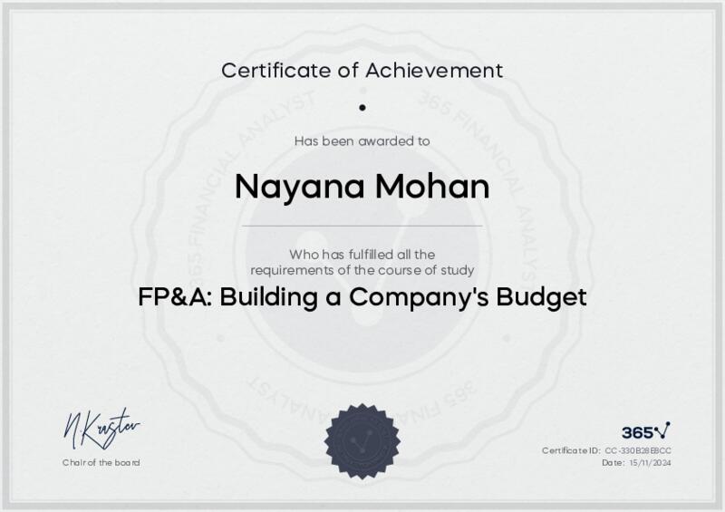 This user has been awarded the FP&A: Building a Company's Budget Certificate for successfully completing the course exam. Holding this certificate demonstrates their proficiency on the topic and signifies they are qualified to apply their newly acquired expertise in the fields of data analytics and data science.