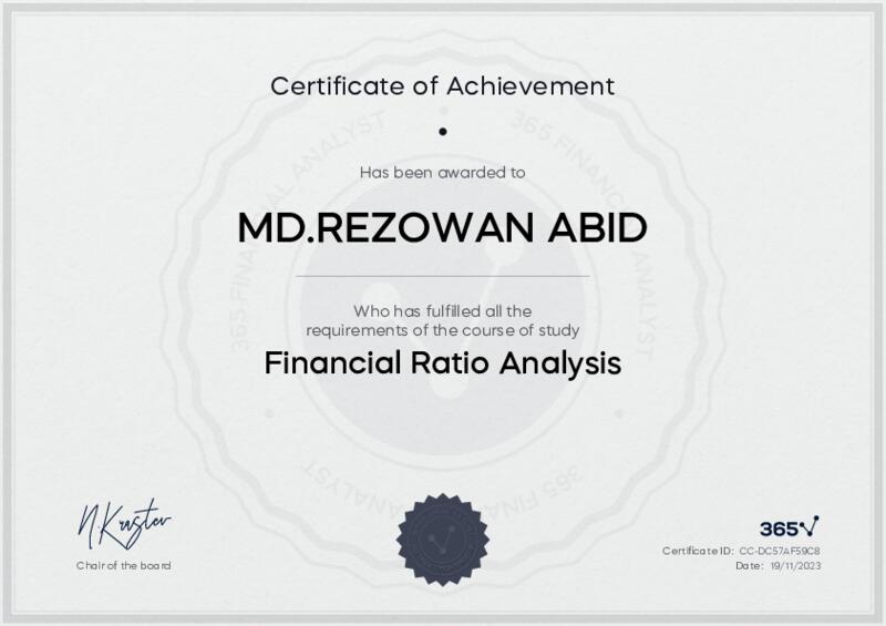 This user has been awarded the Financial Ratio Analysis Certificate for successfully completing the course exam. Holding this certificate demonstrates their proficiency on the topic and signifies they are qualified to apply their newly acquired expertise in the fields of data analytics and data science.