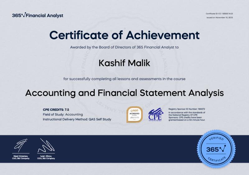 This user has been awarded the Accounting and Financial Statement Analysis Certificate for successfully completing the course exam. Holding this certificate demonstrates their proficiency on the topic and signifies they are qualified to apply their newly acquired expertise in the fields of data analytics and data science.