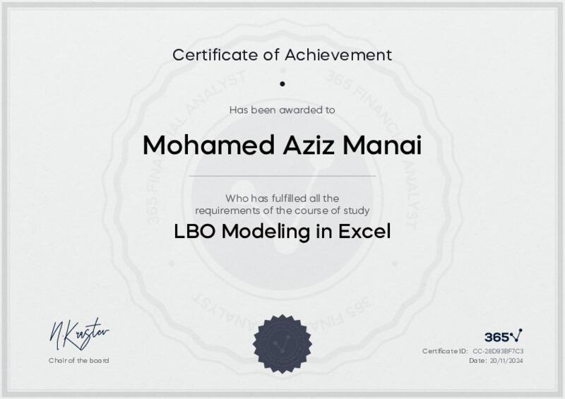 This user has been awarded the LBO Modeling in Excel Certificate for successfully completing the course exam. Holding this certificate demonstrates their proficiency on the topic and signifies they are qualified to apply their newly acquired expertise in the fields of data analytics and data science.