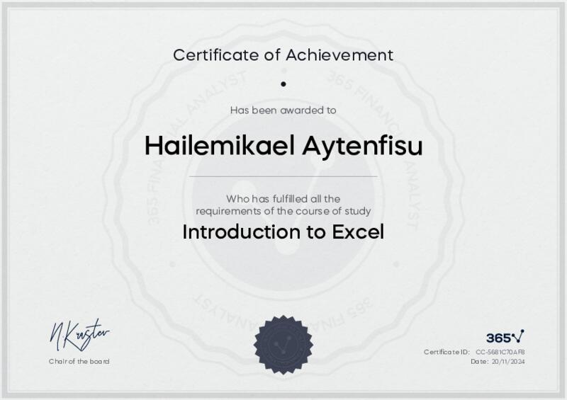 This user has been awarded the Introduction to Excel Certificate for successfully completing the course exam. Holding this certificate demonstrates their proficiency on the topic and signifies they are qualified to apply their newly acquired expertise in the fields of data analytics and data science.