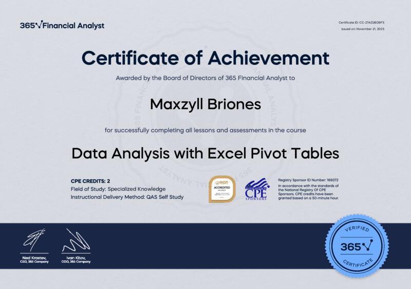 This user has been awarded the Data Analysis with Excel Pivot Tables Certificate for successfully completing the course exam. Holding this certificate demonstrates their proficiency on the topic and signifies they are qualified to apply their newly acquired expertise in the fields of data analytics and data science.