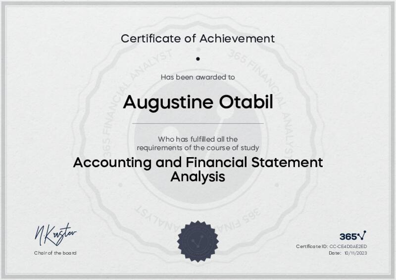 This user has been awarded the Accounting and Financial Statement Analysis Certificate for successfully completing the course exam. Holding this certificate demonstrates their proficiency on the topic and signifies they are qualified to apply their newly acquired expertise in the fields of data analytics and data science.