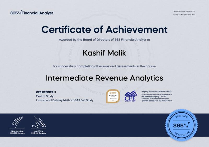 This user has been awarded the Intermediate Revenue Analytics Certificate for successfully completing the course exam. Holding this certificate demonstrates their proficiency on the topic and signifies they are qualified to apply their newly acquired expertise in the fields of data analytics and data science.