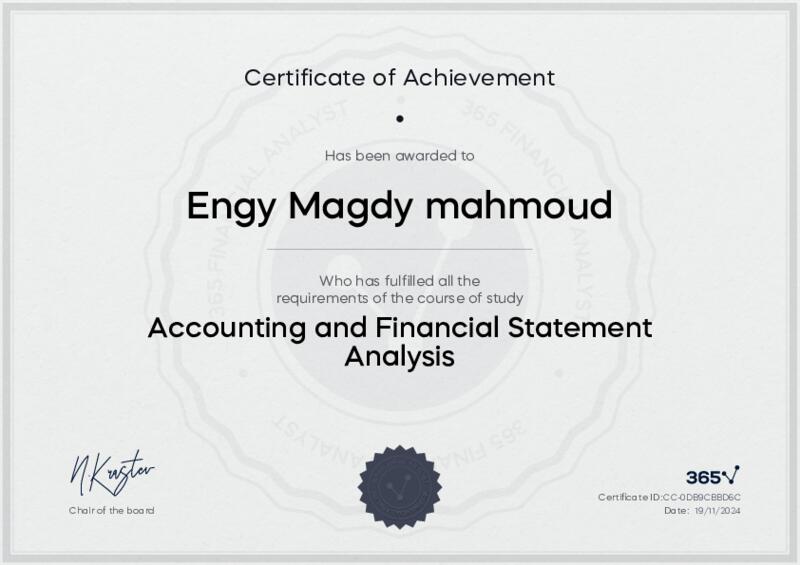 This user has been awarded the Accounting and Financial Statement Analysis Certificate for successfully completing the course exam. Holding this certificate demonstrates their proficiency on the topic and signifies they are qualified to apply their newly acquired expertise in the fields of data analytics and data science.