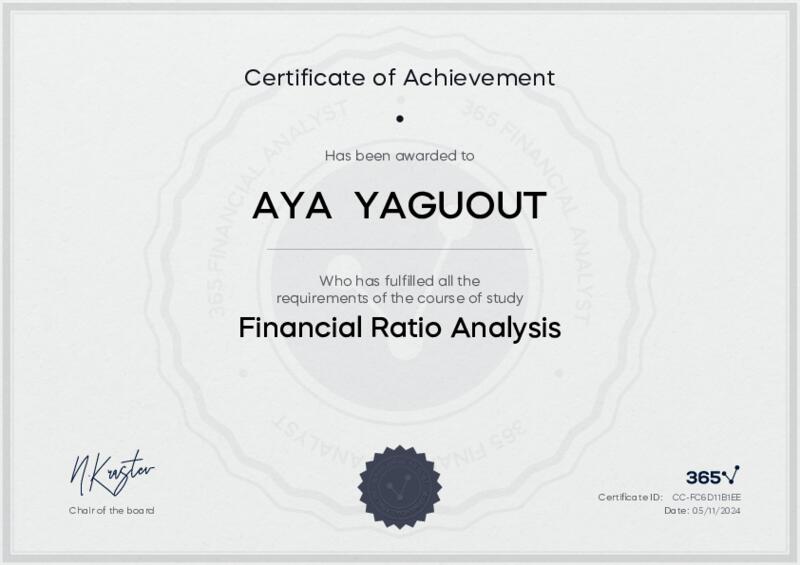 This user has been awarded the Financial Ratio Analysis Certificate for successfully completing the course exam. Holding this certificate demonstrates their proficiency on the topic and signifies they are qualified to apply their newly acquired expertise in the fields of data analytics and data science.