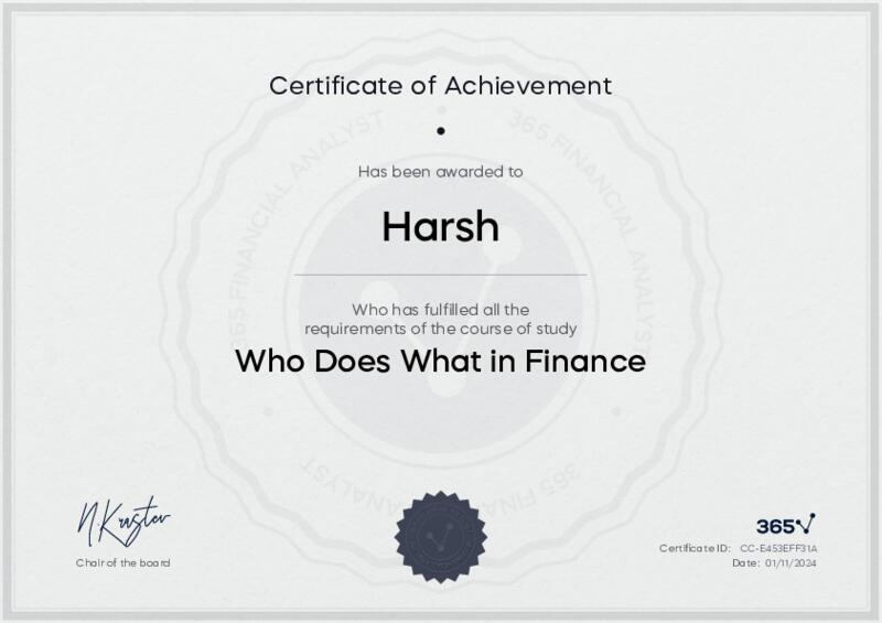 This user has been awarded the Who Does What in Finance Certificate for successfully completing the course exam. Holding this certificate demonstrates their proficiency on the topic and signifies they are qualified to apply their newly acquired expertise in the fields of data analytics and data science.