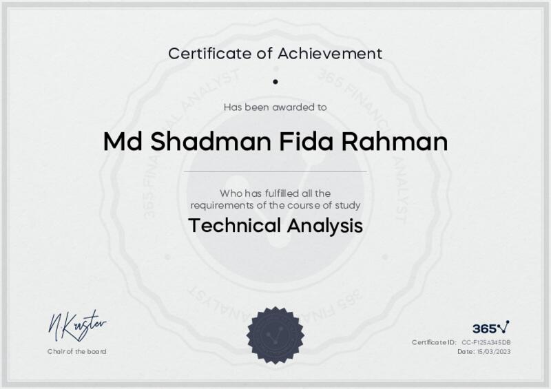 This user has been awarded the Technical Analysis Certificate for successfully completing the course exam. Holding this certificate demonstrates their proficiency on the topic and signifies they are qualified to apply their newly acquired expertise in the fields of data analytics and data science.