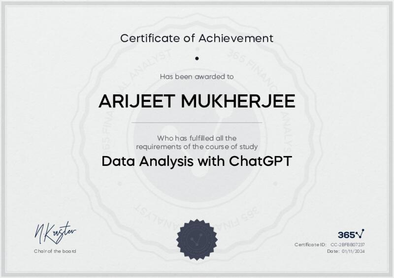 This user has been awarded the Data Analysis with ChatGPT Certificate for successfully completing the course exam. Holding this certificate demonstrates their proficiency on the topic and signifies they are qualified to apply their newly acquired expertise in the fields of data analytics and data science.