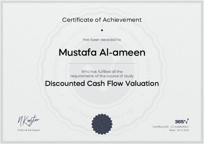 This user has been awarded the Discounted Cash Flow Valuation Certificate for successfully completing the course exam. Holding this certificate demonstrates their proficiency on the topic and signifies they are qualified to apply their newly acquired expertise in the fields of data analytics and data science.