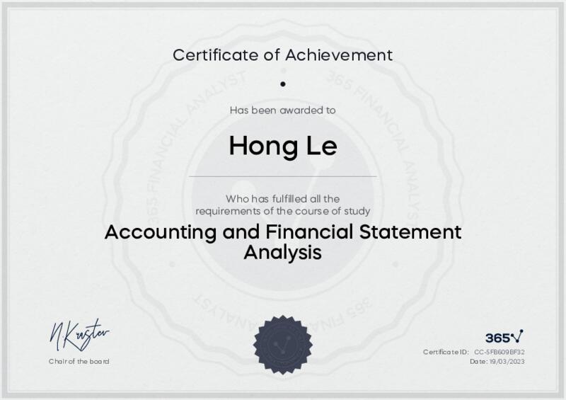 This user has been awarded the Accounting and Financial Statement Analysis Certificate for successfully completing the course exam. Holding this certificate demonstrates their proficiency on the topic and signifies they are qualified to apply their newly acquired expertise in the fields of data analytics and data science.