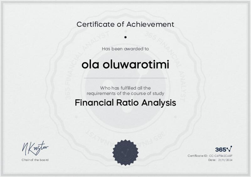 This user has been awarded the Financial Ratio Analysis Certificate for successfully completing the course exam. Holding this certificate demonstrates their proficiency on the topic and signifies they are qualified to apply their newly acquired expertise in the fields of data analytics and data science.
