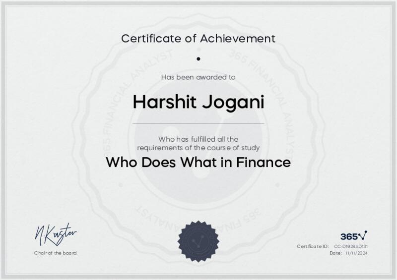 This user has been awarded the Who Does What in Finance Certificate for successfully completing the course exam. Holding this certificate demonstrates their proficiency on the topic and signifies they are qualified to apply their newly acquired expertise in the fields of data analytics and data science.