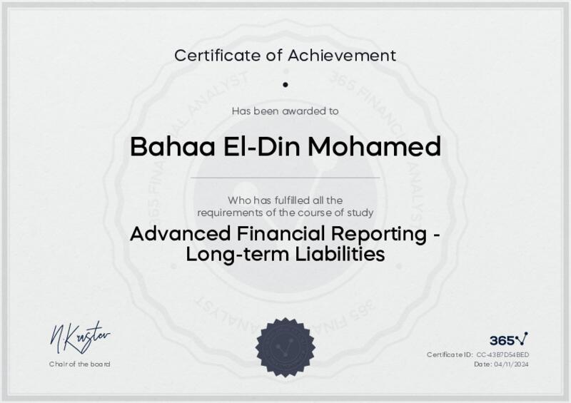 This user has been awarded the Advanced Financial Reporting - Long-term Liabilities Certificate for successfully completing the course exam. Holding this certificate demonstrates their proficiency on the topic and signifies they are qualified to apply their newly acquired expertise in the fields of data analytics and data science.