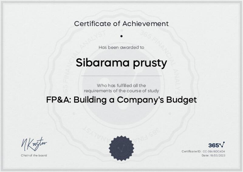 This user has been awarded the FP&A: Building a Company's Budget Certificate for successfully completing the course exam. Holding this certificate demonstrates their proficiency on the topic and signifies they are qualified to apply their newly acquired expertise in the fields of data analytics and data science.