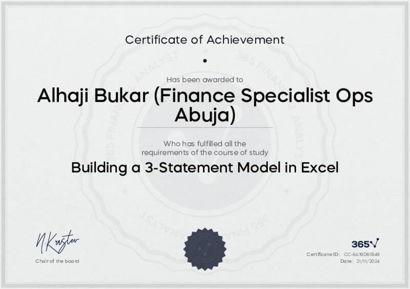 This user has been awarded the Building a 3-Statement Model in Excel Certificate for successfully completing the course exam. Holding this certificate demonstrates their proficiency on the topic and signifies they are qualified to apply their newly acquired expertise in the fields of data analytics and data science.