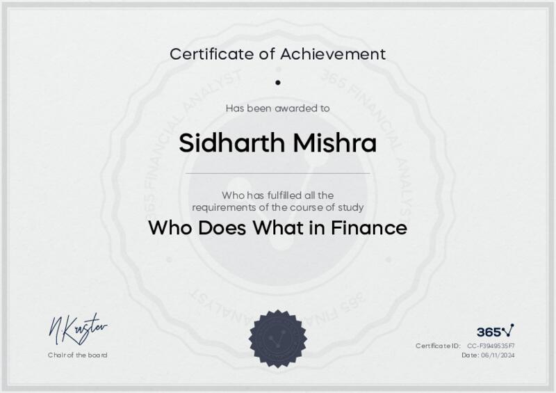 This user has been awarded the Who Does What in Finance Certificate for successfully completing the course exam. Holding this certificate demonstrates their proficiency on the topic and signifies they are qualified to apply their newly acquired expertise in the fields of data analytics and data science.