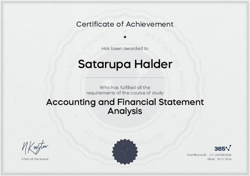 This user has been awarded the Accounting and Financial Statement Analysis Certificate for successfully completing the course exam. Holding this certificate demonstrates their proficiency on the topic and signifies they are qualified to apply their newly acquired expertise in the fields of data analytics and data science.