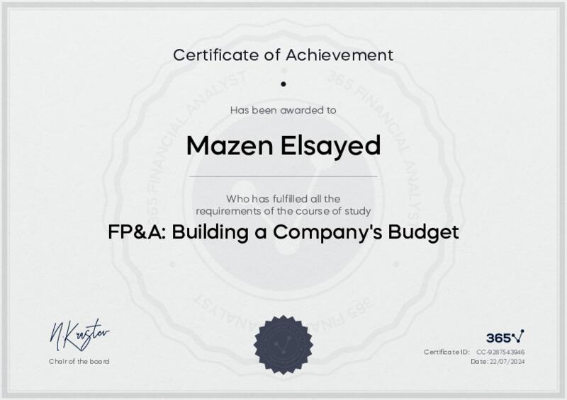 This user has been awarded the FP&A: Building a Company's Budget Certificate for successfully completing the course exam. Holding this certificate demonstrates their proficiency on the topic and signifies they are qualified to apply their newly acquired expertise in the fields of data analytics and data science.