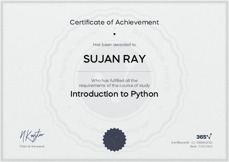 This user has been awarded the Introduction to Python Certificate for successfully completing the course exam. Holding this certificate demonstrates their proficiency on the topic and signifies they are qualified to apply their newly acquired expertise in the fields of data analytics and data science.