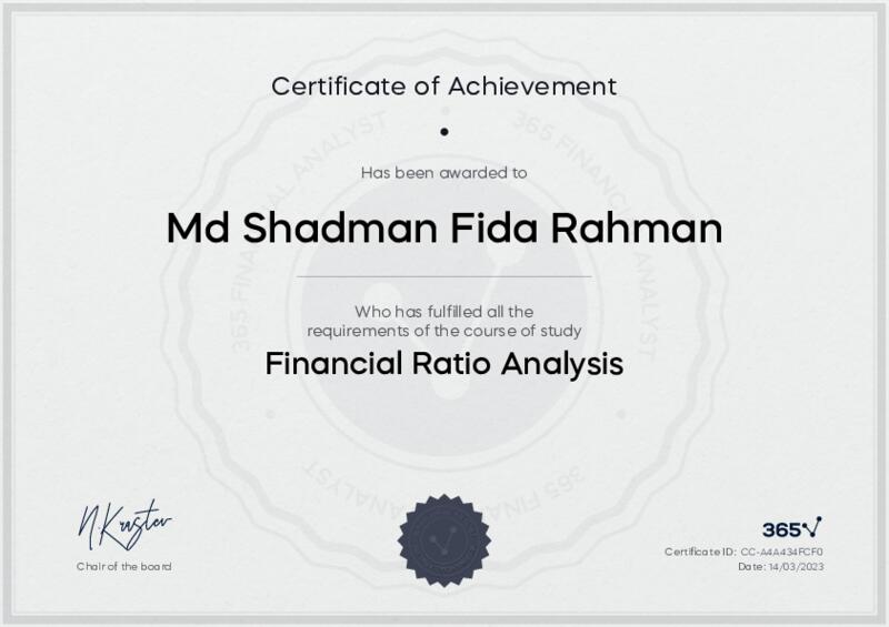 This user has been awarded the Financial Ratio Analysis Certificate for successfully completing the course exam. Holding this certificate demonstrates their proficiency on the topic and signifies they are qualified to apply their newly acquired expertise in the fields of data analytics and data science.
