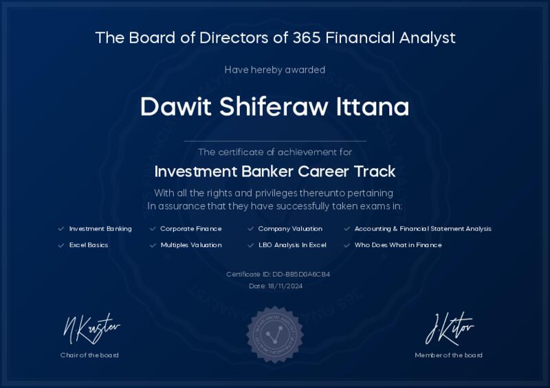 This user has been awarded the Investment Banker Career Track Certificate for successfully completing all courses and assessments. This certificate confirms their technical expertise and professional credibility to work as an investment banker.