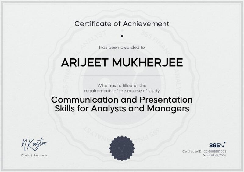 This user has been awarded the Communication and Presentation Skills for Analysts and Managers Certificate for successfully completing the course exam. Holding this certificate demonstrates their proficiency on the topic and signifies they are qualified to apply their newly acquired expertise in the fields of data analytics and data science.