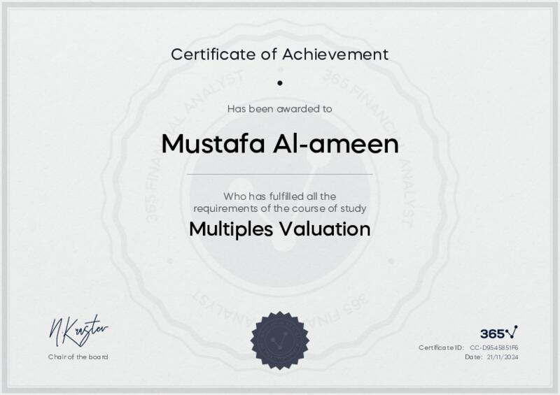 This user has been awarded the Multiples Valuation Certificate for successfully completing the course exam. Holding this certificate demonstrates their proficiency on the topic and signifies they are qualified to apply their newly acquired expertise in the fields of data analytics and data science.