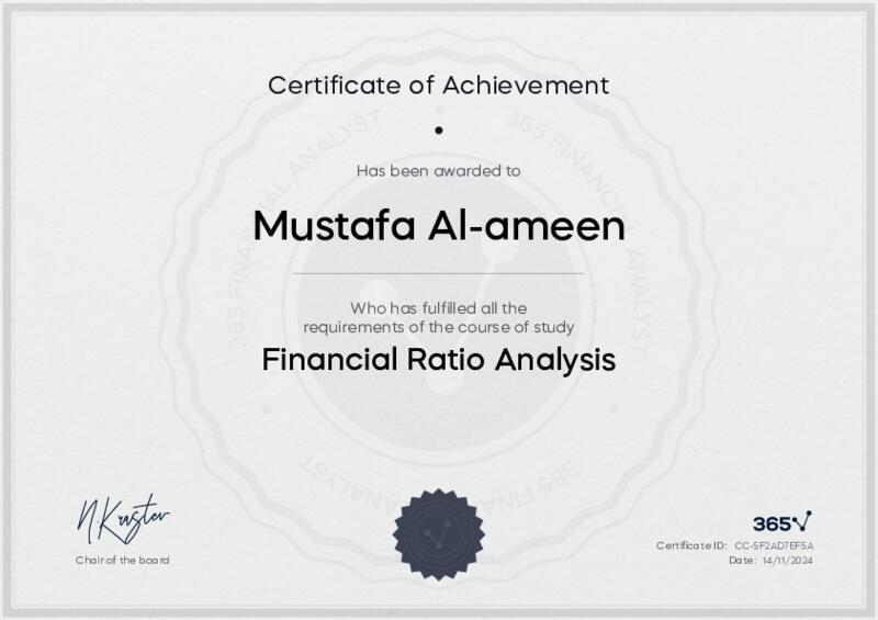 This user has been awarded the Financial Ratio Analysis Certificate for successfully completing the course exam. Holding this certificate demonstrates their proficiency on the topic and signifies they are qualified to apply their newly acquired expertise in the fields of data analytics and data science.