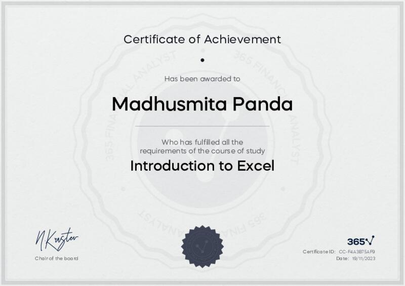 This user has been awarded the Introduction to Excel Certificate for successfully completing the course exam. Holding this certificate demonstrates their proficiency on the topic and signifies they are qualified to apply their newly acquired expertise in the fields of data analytics and data science.