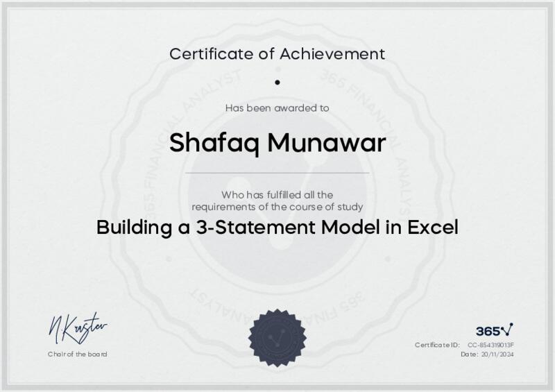 This user has been awarded the Building a 3-Statement Model in Excel Certificate for successfully completing the course exam. Holding this certificate demonstrates their proficiency on the topic and signifies they are qualified to apply their newly acquired expertise in the fields of data analytics and data science.