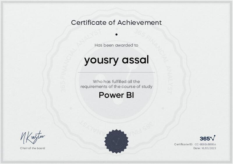 This user has been awarded the Power BI Certificate for successfully completing the course exam. Holding this certificate demonstrates their proficiency on the topic and signifies they are qualified to apply their newly acquired expertise in the fields of data analytics and data science.
