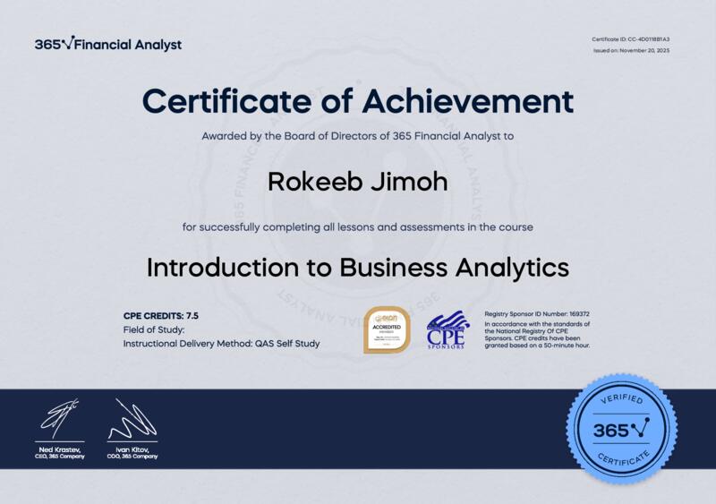 This user has been awarded the Introduction to Business Analytics Certificate for successfully completing the course exam. Holding this certificate demonstrates their proficiency on the topic and signifies they are qualified to apply their newly acquired expertise in the fields of data analytics and data science.