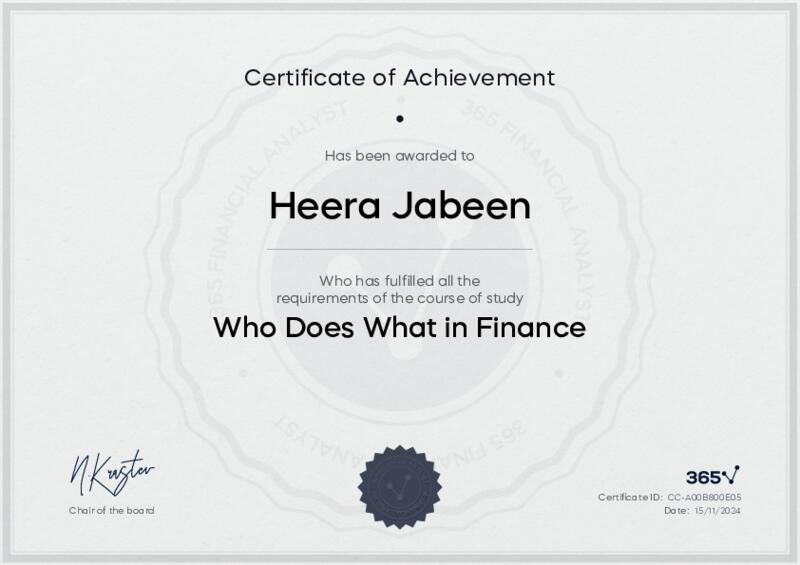 This user has been awarded the Who Does What in Finance Certificate for successfully completing the course exam. Holding this certificate demonstrates their proficiency on the topic and signifies they are qualified to apply their newly acquired expertise in the fields of data analytics and data science.