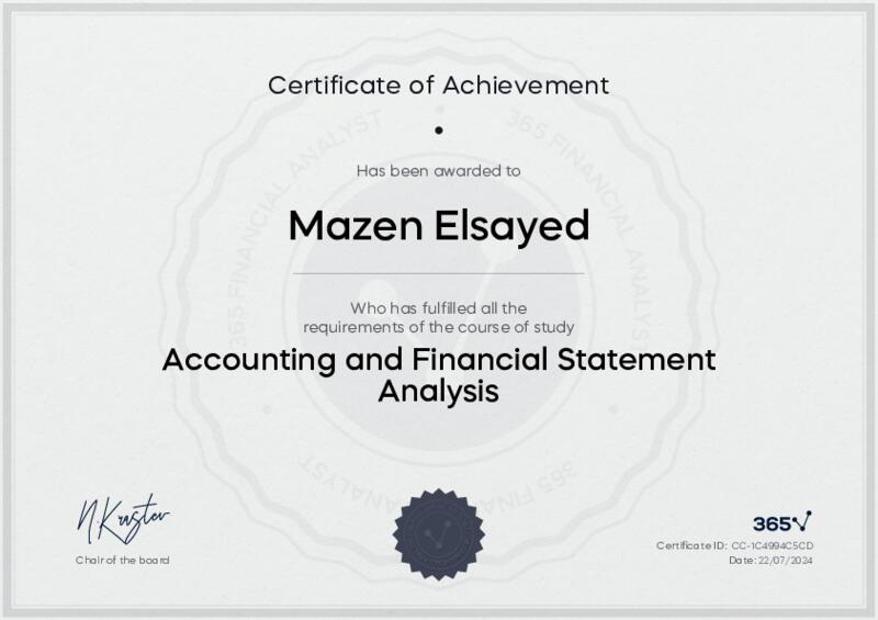 This user has been awarded the Accounting and Financial Statement Analysis Certificate for successfully completing the course exam. Holding this certificate demonstrates their proficiency on the topic and signifies they are qualified to apply their newly acquired expertise in the fields of data analytics and data science.