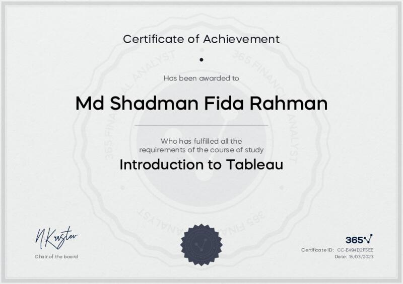 This user has been awarded the Introduction to Tableau Certificate for successfully completing the course exam. Holding this certificate demonstrates their proficiency on the topic and signifies they are qualified to apply their newly acquired expertise in the fields of data analytics and data science.
