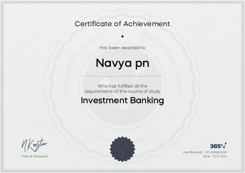 This user has been awarded the Investment Banking Certificate for successfully completing the course exam. Holding this certificate demonstrates their proficiency on the topic and signifies they are qualified to apply their newly acquired expertise in the fields of data analytics and data science.