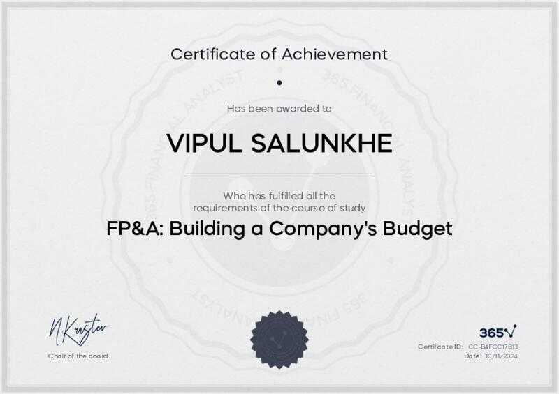 This user has been awarded the FP&A: Building a Company's Budget Certificate for successfully completing the course exam. Holding this certificate demonstrates their proficiency on the topic and signifies they are qualified to apply their newly acquired expertise in the fields of data analytics and data science.