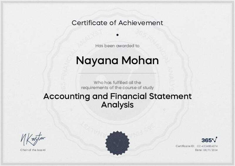 This user has been awarded the Accounting and Financial Statement Analysis Certificate for successfully completing the course exam. Holding this certificate demonstrates their proficiency on the topic and signifies they are qualified to apply their newly acquired expertise in the fields of data analytics and data science.