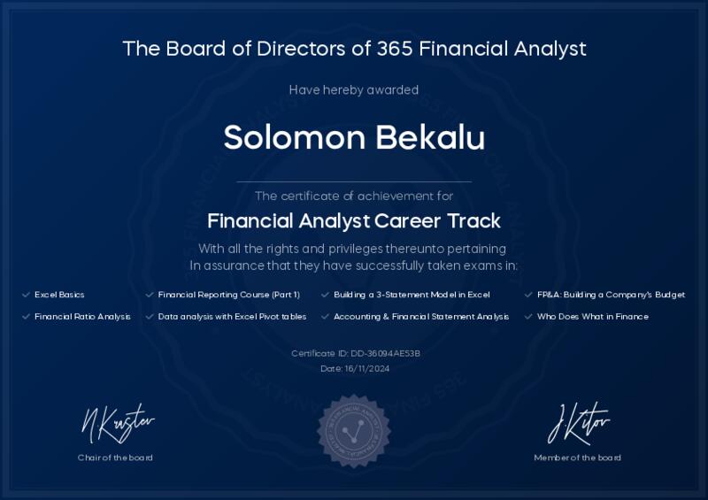 This user has been awarded the Financial Analyst Career Track Certificate for successfully completing all courses and assessments. This certificate confirms their technical expertise and professional credibility to work as a financial analyst.