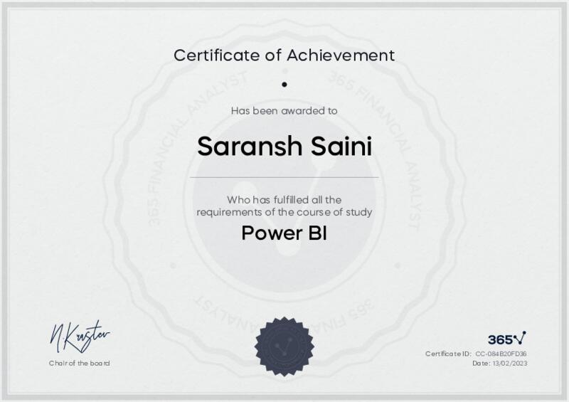 This user has been awarded the Power BI Certificate for successfully completing the course exam. Holding this certificate demonstrates their proficiency on the topic and signifies they are qualified to apply their newly acquired expertise in the fields of data analytics and data science.