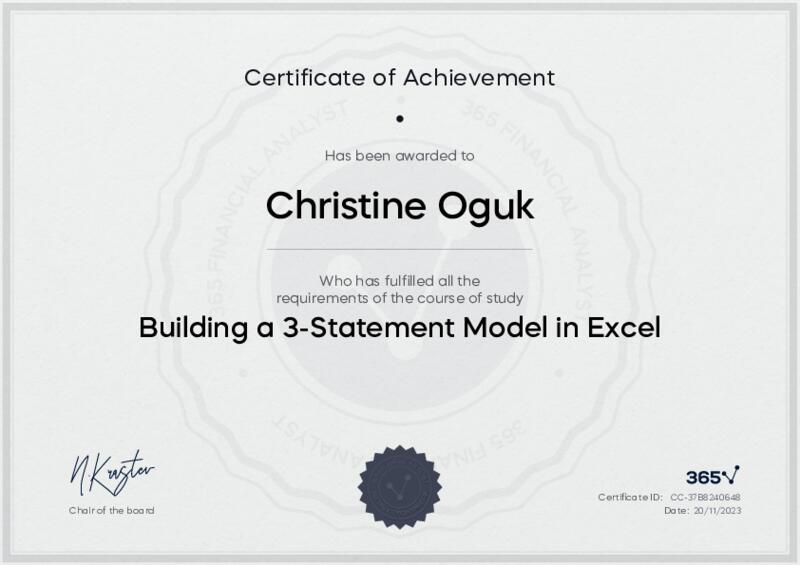 This user has been awarded the Building a 3-Statement Model in Excel Certificate for successfully completing the course exam. Holding this certificate demonstrates their proficiency on the topic and signifies they are qualified to apply their newly acquired expertise in the fields of data analytics and data science.