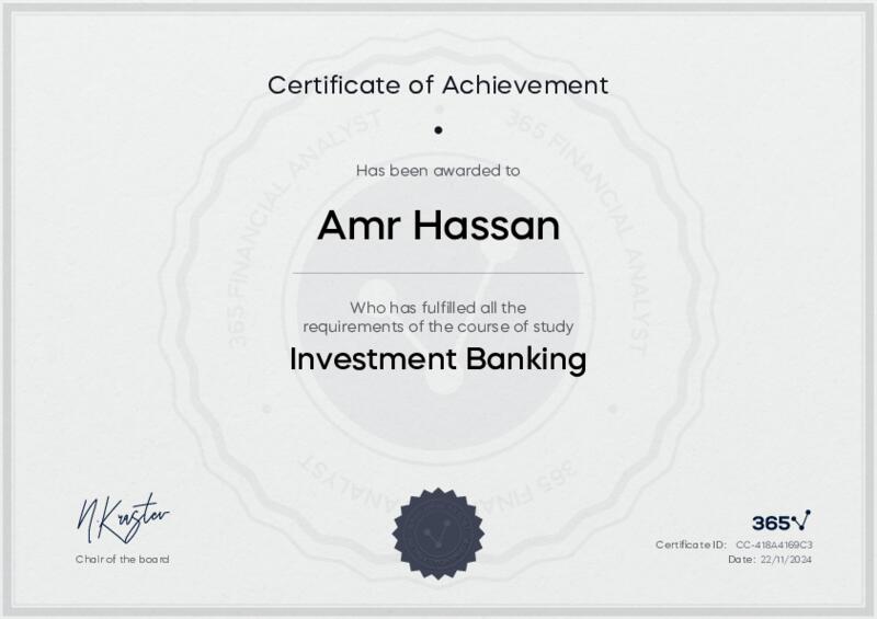 This user has been awarded the Investment Banking Certificate for successfully completing the course exam. Holding this certificate demonstrates their proficiency on the topic and signifies they are qualified to apply their newly acquired expertise in the fields of data analytics and data science.