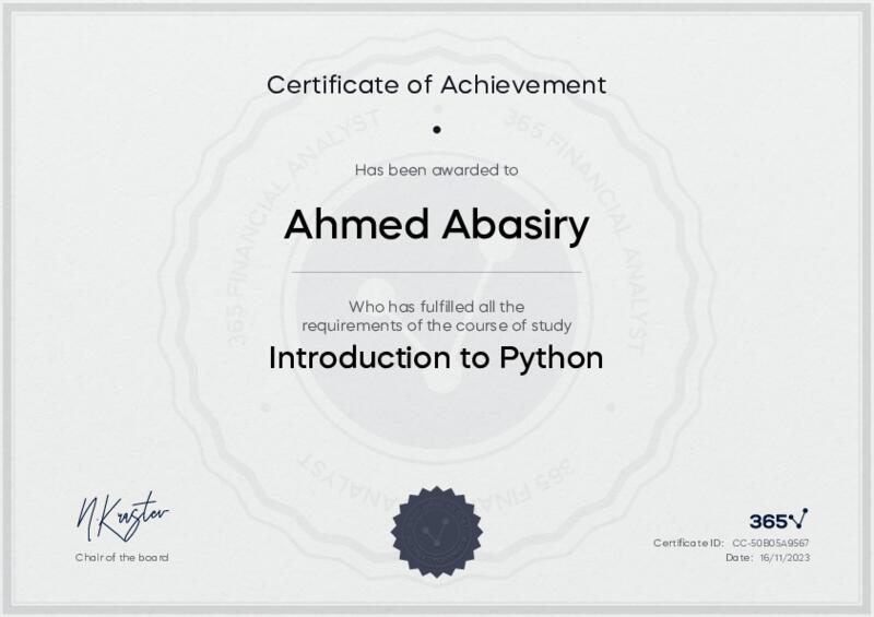 This user has been awarded the Introduction to Python Certificate for successfully completing the course exam. Holding this certificate demonstrates their proficiency on the topic and signifies they are qualified to apply their newly acquired expertise in the fields of data analytics and data science.