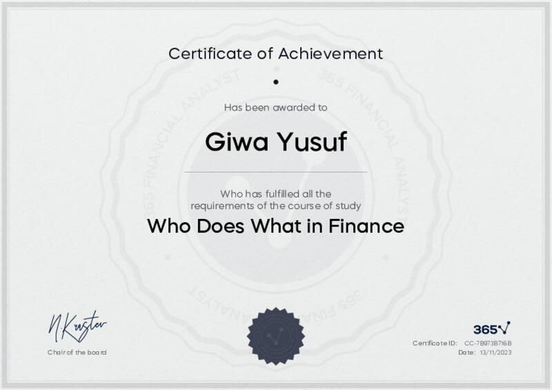 This user has been awarded the Who Does What in Finance Certificate for successfully completing the course exam. Holding this certificate demonstrates their proficiency on the topic and signifies they are qualified to apply their newly acquired expertise in the fields of data analytics and data science.