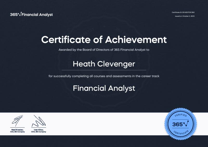 This user has been awarded the Financial Analyst Career Track Certificate for successfully completing all courses and assessments. This certificate confirms their technical expertise and professional credibility to work as a financial analyst.